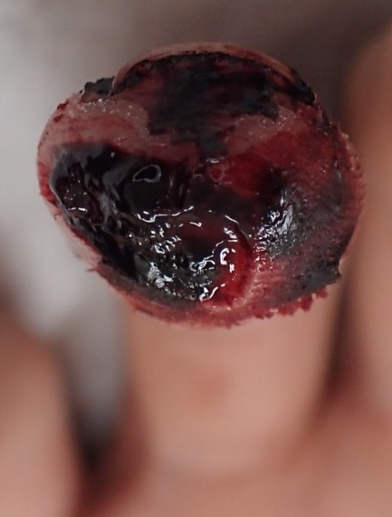 見た目はかなり痛々しい傷ですが、湿潤療法で治療致しますと、ほとんど痛みを感じずに、元の指に綺麗に戻ります。指紋まで戻ります。